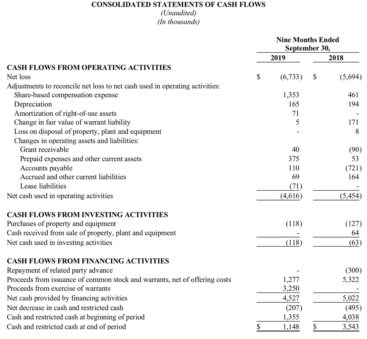 For the nine months ended September 30, 2019, the Company reported a net loss of $6.7 million, or a net loss per share of $1.02, compared to a net loss of $5.7 million, or a net loss per share of $1.40 for the nine months ended September 30, 2018. The $1.0 million year-over-year increase in net loss was due primarily to a $1.2 million increase in research and development costs and a $0.2 million increase in general and administrative expenses, offset in part by a $0.2 million net decrease in expense from change in the fair value of warrants. In addition, the Company recognized grant income for qualified expenditures from the SBIR grant of $473,000 for the current nine-month period compared to $225,000 for the similar nine-month period in 2018.